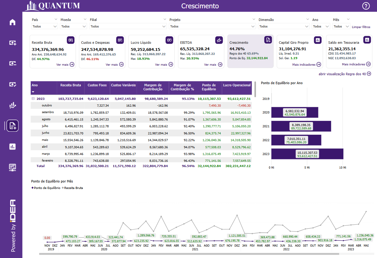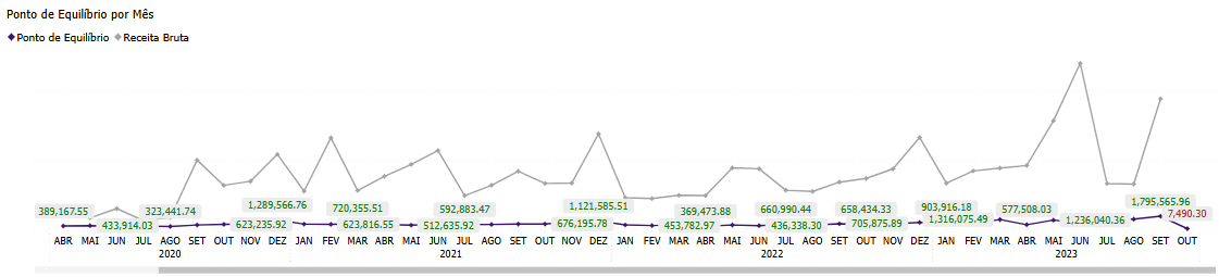 Além disso, essa visualização interage com outros indicadores financeiros no painel, como crescimento de receita bruta, custos e despesas ou EBITDA. Por exemplo, se a empresa não atingir o Ponto de Equilíbrio em um determinado mês, os usuários podem facilmente cruzar essa informação com outras métricas, como queda na receita ou aumento de custos no mesmo período, ajudando a identificar as causas subjacentes. Essa interconexão promove uma compreensão mais profunda de como diferentes componentes financeiros influenciam o equilíbrio da empresa, apoiando uma tomada de decisão mais estratégica e informada.