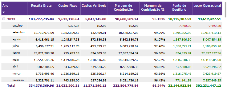 Por fim, a coluna de Lucro Operacional reflete o valor restante após a dedução de todos os custos, destacando a real lucratividade da empresa. Monitorar esse indicador permite avaliar se a empresa está crescendo de forma sustentável e se suas margens são suficientes para garantir a viabilidade no longo prazo.