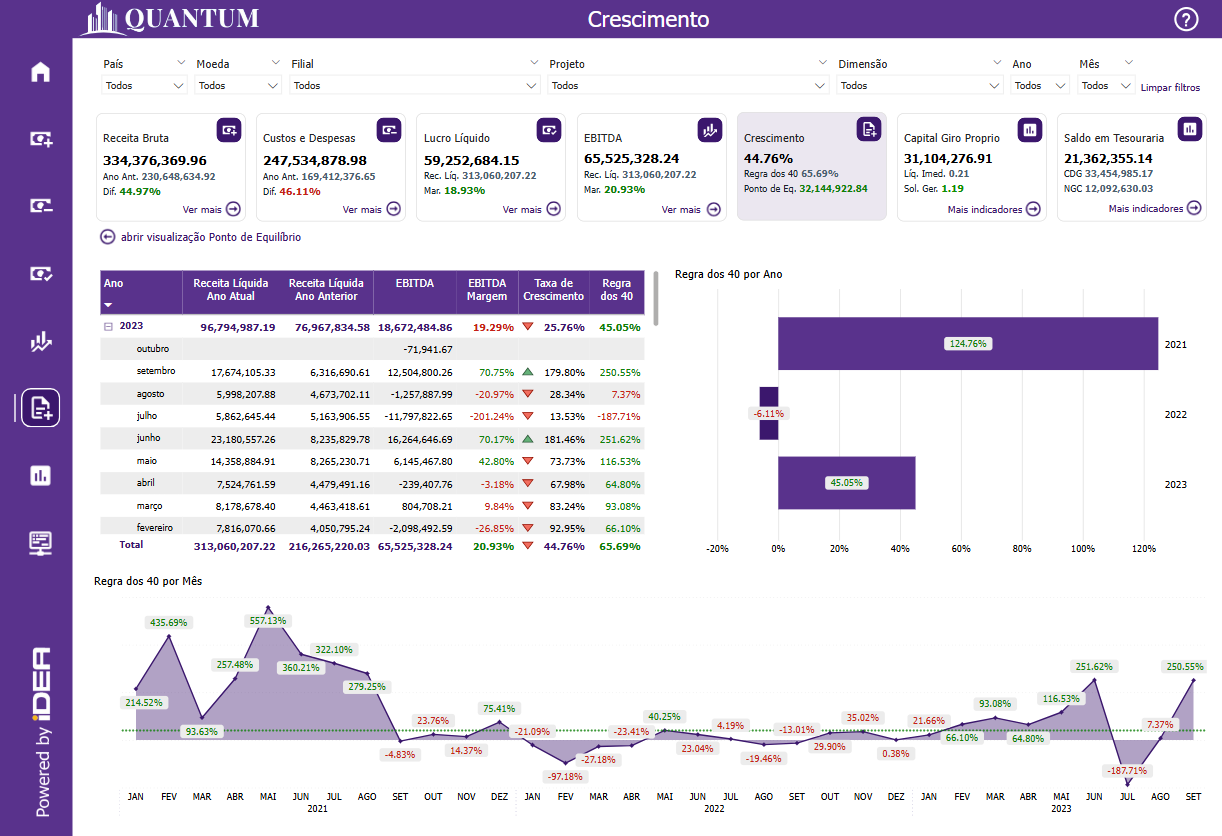 Além disso, essa visualização interage com outros indicadores financeiros no painel, como crescimento de receita bruta, custos e despesas ou EBITDA. Por exemplo, se a Regra dos 40 cair abaixo do limite de 40% em um determinado mês, os usuários podem facilmente cruzar essa informação com outras métricas, como queda na receita ou aumento de custos no mesmo período, ajudando a identificar as causas subjacentes. Essa interconexão promove uma compreensão mais profunda de como diferentes componentes financeiros influenciam a Regra dos 40, apoiando uma tomada de decisão mais estratégica e informada.