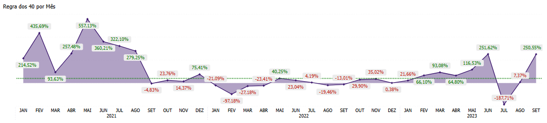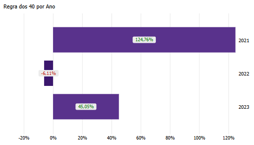 Este gráfico de barras exibe a Regra dos 40 por ano, oferecendo uma visão clara e objetiva do desempenho da empresa em relação a essa métrica essencial ao longo do tempo. A Regra dos 40 equilibra o crescimento da receita e a lucratividade operacional, sendo amplamente utilizada, para avaliar o alinhamento entre esses dois aspectos críticos. O gráfico apresenta barras que representam o desempenho anual da empresa, com rótulos de texto que mudam de cor conforme o desempenho em relação à meta de 40%. Quando o valor da Regra dos 40 está abaixo de 40%, os rótulos ficam em vermelho, sinalizando um possível desequilíbrio, onde o crescimento pode estar sendo priorizado em detrimento da lucratividade. Quando o valor é igual ou superior a 40%, os rótulos aparecem em verde, indicando que a empresa está atingindo ou superando a meta, refletindo um equilíbrio saudável entre crescimento e rentabilidade.