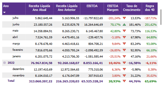 Por fim, a coluna de Regra dos 40 resume a métrica que combina o crescimento da receita e a margem EBITDA. Essa regra é um indicador crucial para avaliar se a empresa está equilibrando crescimento e rentabilidade de maneira saudável. O valor dessa coluna também utiliza um esquema de cores intuitivo para destacar o desempenho: o texto é exibido em verde quando a soma do crescimento da receita e da margem EBITDA é igual ou superior a 40%, indicando que a empresa está dentro dos padrões ideais de crescimento sustentável. Quando essa soma fica abaixo de 40%, o texto é exibido em vermelho, sinalizando um possível desequilíbrio entre crescimento e eficiência operacional, o que pode exigir atenção por parte da gestão.