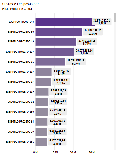 Este gráfico de barras exibe os Custos e Despesas, oferecendo a capacidade de alternar entre diferentes níveis de análise: Filial, Projeto ou Conta. Essa funcionalidade proporciona uma visão detalhada e dinâmica dos custos e despesas associados a cada Filial, Projeto ou Conta, permitindo uma compreensão aprofundada de como esses fatores contribuem para o total de despesas da empresa. A flexibilidade para alternar entre esses níveis facilita comparações granulares e ajuda a identificar quais unidades ou iniciativas estão mais impactando o desempenho financeiro.
