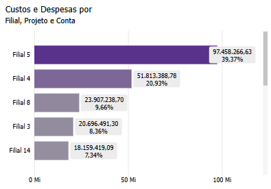 Aqui, você pode explorar diferentes níveis hierárquicos, como Filial, Projeto ou Conta, para analisar a área de interesse desejada.