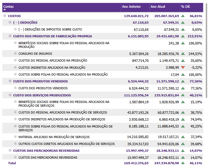 Além disso, a inclusão de ícones ao lado de cada Diferença Percentual melhora a clareza visual dos dados. Ícones verdes indicam uma redução nos custos, ícones vermelhos sinalizam um aumento nas despesas e ícones amarelos denotam estabilidade. Esse sistema de codificação por cores oferece pistas visuais rápidas, facilitando a interpretação imediata dos dados e ajudando a identificar áreas de atenção ou eficiência. No geral, a tabela é uma ferramenta poderosa para uma análise financeira detalhada, permitindo uma compreensão profunda das dinâmicas de custos e apoiando decisões estratégicas.