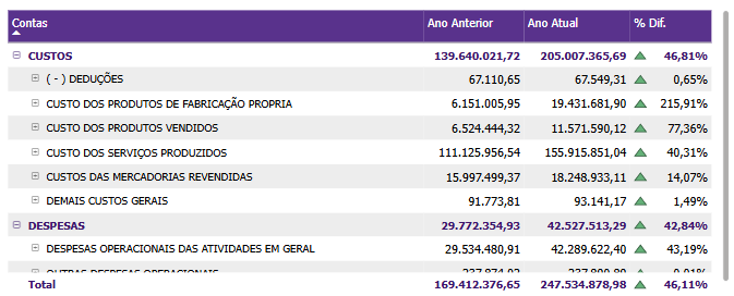 A matriz também permite expandir e recolher hierarquias, oferecendo uma visualização dinâmica dos dados. Clicar no sinal de mais (+) ao lado de uma conta revela os níveis de conta abaixo. Essa hierarquia expandida facilita a análise aprofundada, permitindo que os usuários rastreiem o impacto de cada conta em detalhes e sua contribuição para o total de custos e despesas. Da mesma forma, os usuários podem recolher a hierarquia clicando no sinal de menos (-), permitindo uma navegação mais simplificada para quando uma visão geral é suficiente.