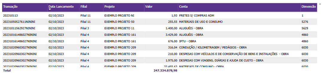 A organização por transação facilita a identificação e rastreamento de cada item de despesa, permitindo a conciliação com outros sistemas e a verificação detalhada das entradas. A coluna de data de lançamento permite acompanhar a cronologia das despesas, fornecendo uma visão clara sobre quando os custos foram incorridos. A coluna de filial revela a unidade da empresa responsável pela despesa, proporcionando uma visão regionalizada das operações e ajudando a identificar áreas com maiores custos. A coluna de projeto vincula os custos a projetos específicos, sendo útil para empresas que precisam controlar despesas associadas a diferentes iniciativas.