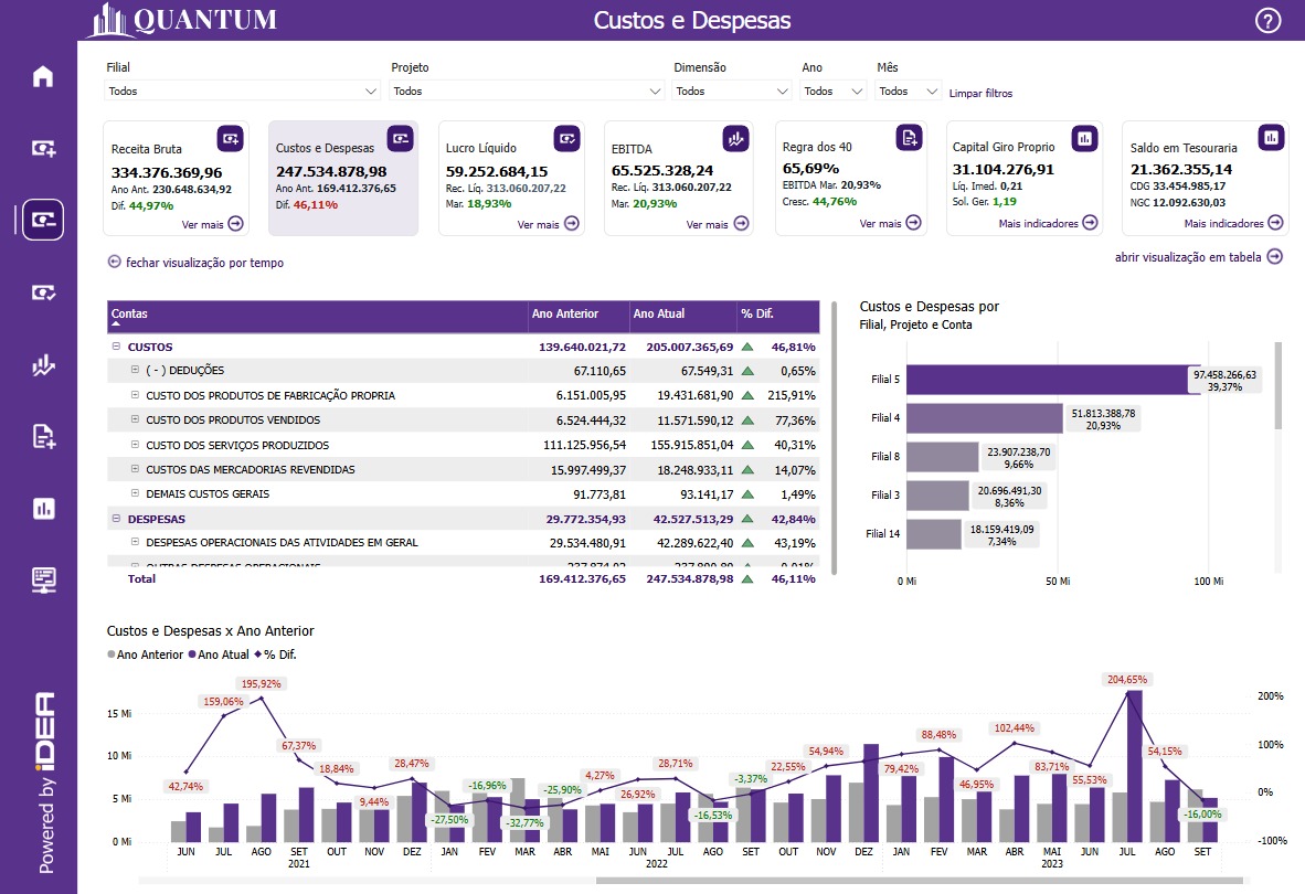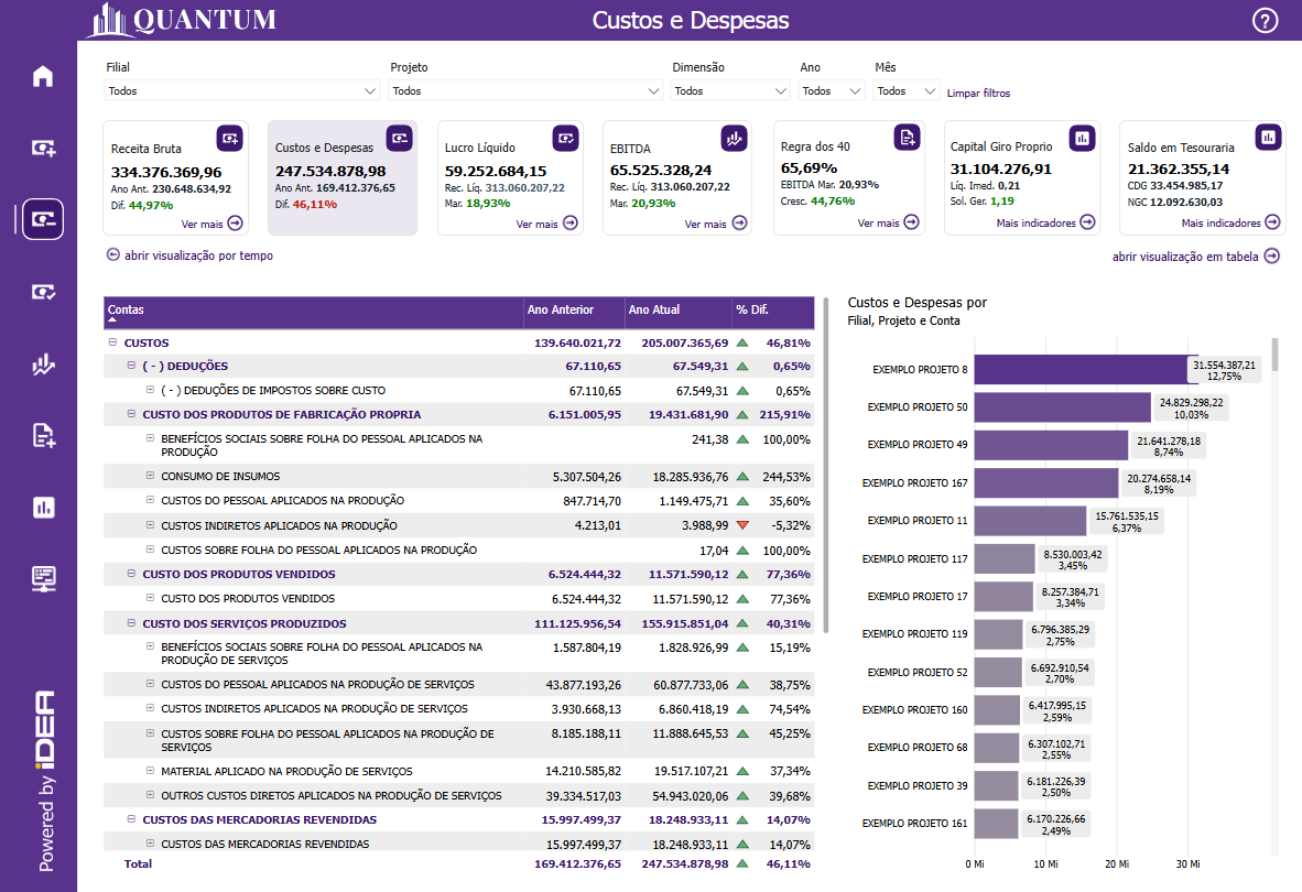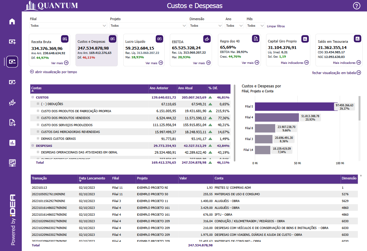 Além disso, o painel oferece uma análise detalhada dos custos por filial, projeto, ou centro de custo, permitindo que a empresa identifique quais áreas estão consumindo mais recursos. Essa análise granular é crucial para entender onde os custos estão concentrados e onde podem ser feitos ajustes para melhorar a eficiência operacional. A segmentação dos custos por diferentes dimensões também permite que as empresas comparem o desempenho de várias unidades ou projetos e façam correções estratégicas.