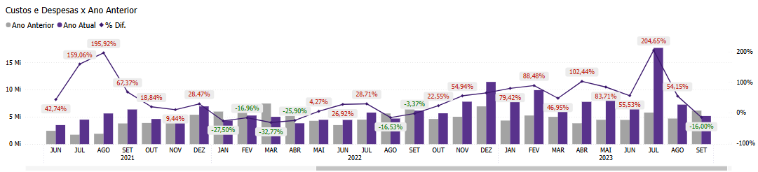 A linha da % diferença é um recurso essencial, pois destaca de forma eficaz as variações de desempenho entre os períodos. Enquanto as barras mostram os valores absolutos, a linha de diferença percentual facilita a identificação rápida das áreas de maior mudança, seja um aumento ou uma redução. Isso permite uma avaliação ágil de onde os custos e despesas mais se alteraram e onde podem ser necessários ajustes.