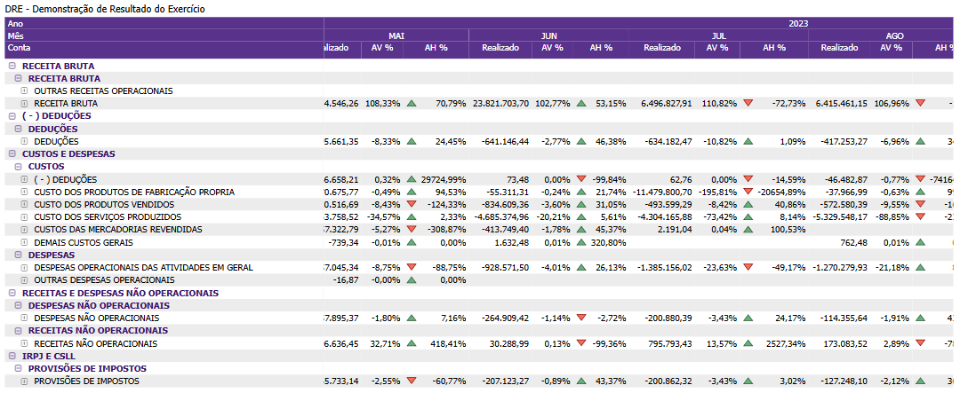 Por outro lado, o AH% (Análise Horizontal) faz a comparação dos números ao longo do tempo, mostrando o crescimento ou declínio de cada item em relação ao período anterior. Esse método é crucial para identificar tendências e avaliar o crescimento ou declínio no desempenho financeiro ao longo de vários períodos. Por exemplo, um crescimento de 10% nas despesas operacionais em comparação ao ano anterior poderia ser um alerta para investigar potenciais ineficiências ou aumentos de custo.