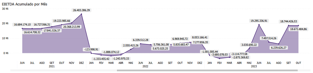 A análise do EBITDA Acumulado é particularmente importante em relatórios de contabilidade, pois permite que os gestores observem o impacto das operações e estratégias ao longo de um período prolongado. Ao invés de apenas visualizar os resultados de meses individuais, este gráfico revela o efeito composto dos ganhos e perdas, possibilitando uma avaliação mais precisa da estabilidade e saúde financeira da empresa. Ele também ajuda a identificar tendências de longo prazo e entender se a empresa está conseguindo manter um crescimento consistente ou se há flutuações que podem sinalizar áreas problemáticas, como aumento de custos operacionais ou redução de eficiência.