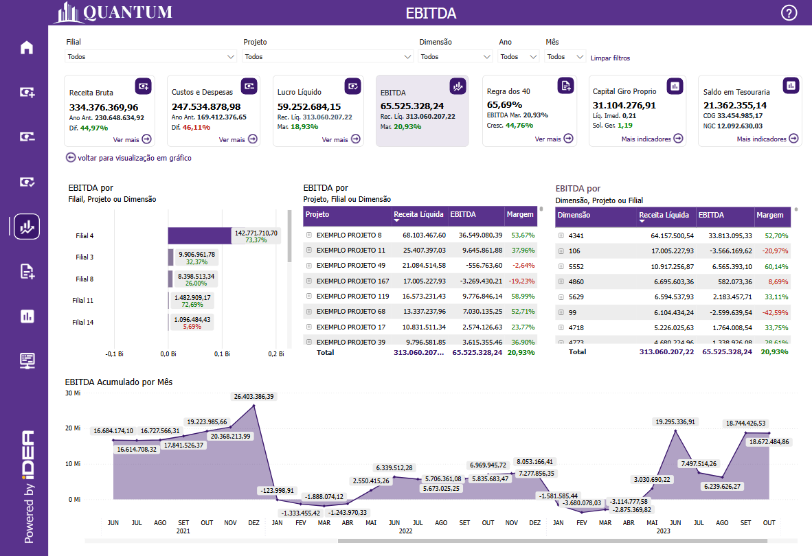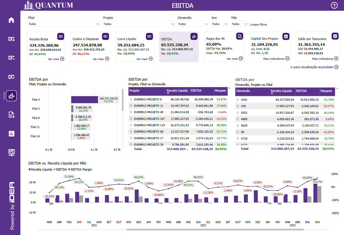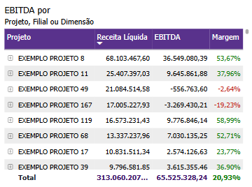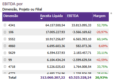 Os valores absolutos de Receita Líquida, EBITDA e a Margem de EBITDA (%) são exibidos para cada dimensão, projeto ou filial, permitindo uma avaliação precisa da rentabilidade operacional de cada segmento. A Margem de EBITDA (%) possui um código de cores que facilita a identificação de margens de risco ou sucesso: valores abaixo de 20% são destacados em vermelho, indicando baixa lucratividade operacional ou áreas de atenção, enquanto margens acima de 20% aparecem em verde, sinalizando saúde financeira. Essa diferenciação visual imediata ajuda a identificar rapidamente áreas críticas que precisam de ajustes, assim como aquelas que estão gerando resultados positivos.