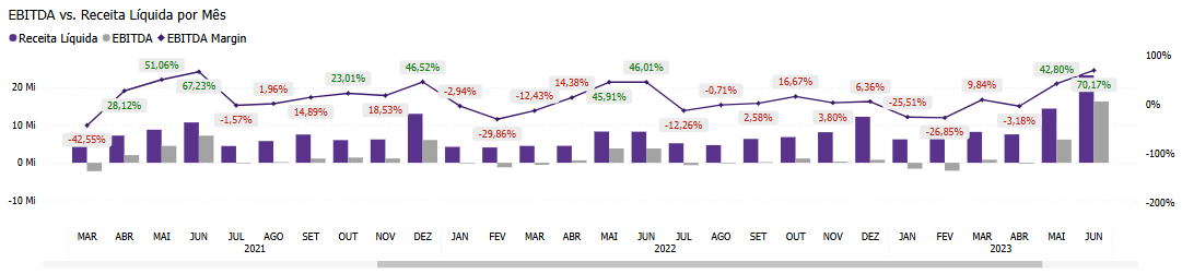Esse gráfico é crucial para a análise do EBITDA, pois permite observar não apenas os valores absolutos de receita e EBITDA, mas também como a margem de EBITDA está evoluindo ao longo dos meses. O monitoramento dessa margem ao longo do tempo ajuda a identificar padrões sazonais, picos de rentabilidade e períodos de baixo desempenho, fornecendo insights valiosos sobre a eficácia das estratégias financeiras e operacionais. A presença da linha de margem também ajuda a contextualizar a relação entre receita e EBITDA: mesmo que a receita seja alta, uma margem de EBITDA baixa pode indicar problemas de controle de custos ou eficiência operacional.