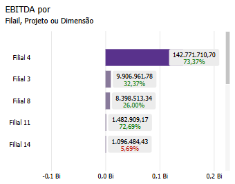 A combinação do valor absoluto do EBITDA com a exibição detalhada da Margem de EBITDA (%) em cada barra oferece uma análise completa da saúde financeira de cada segmento. O gráfico é ideal para decisões estratégicas, pois permite uma comparação direta entre diferentes áreas de atuação, facilitando a identificação de quais filiais, projetos ou dimensões estão desempenhando melhor e quais estão enfrentando desafios operacionais.