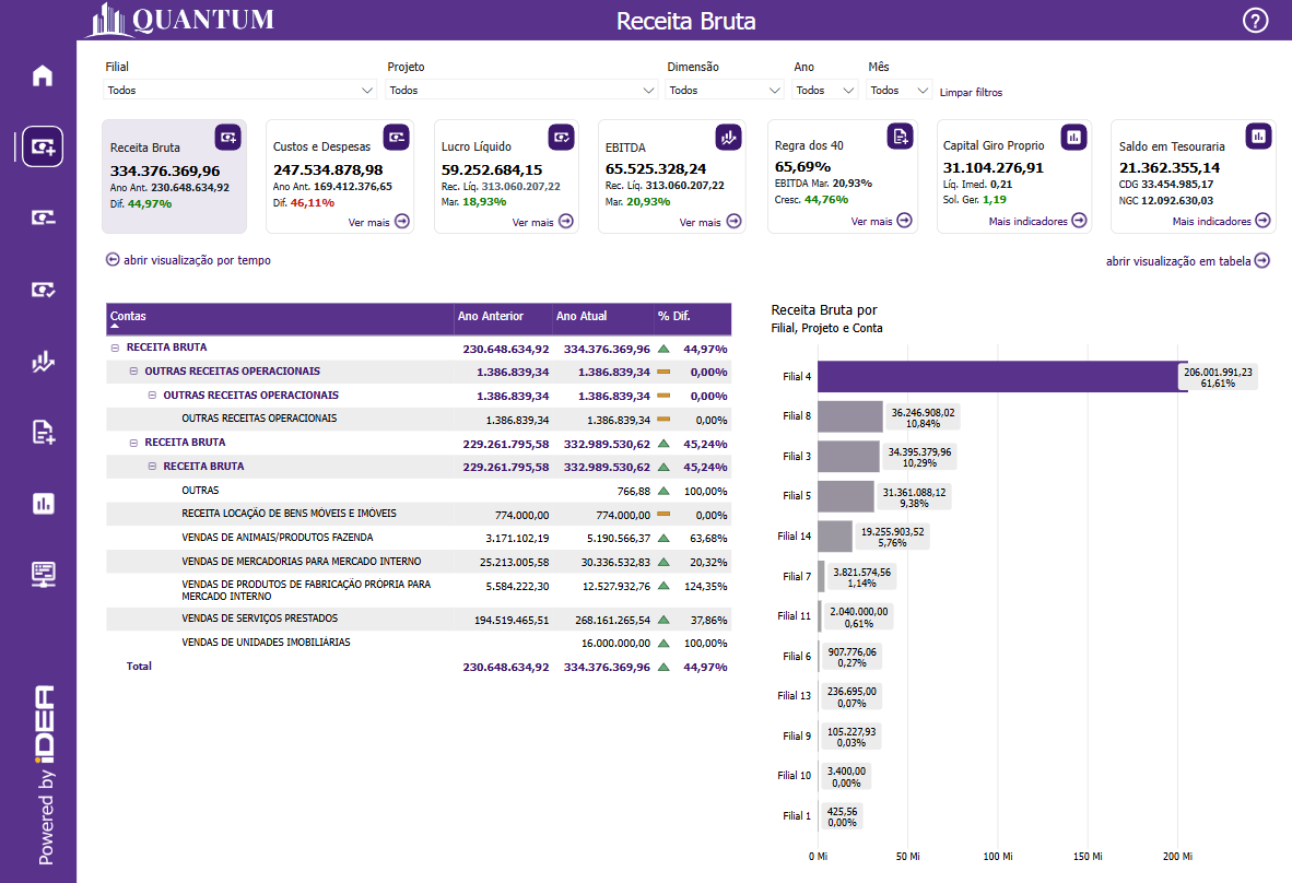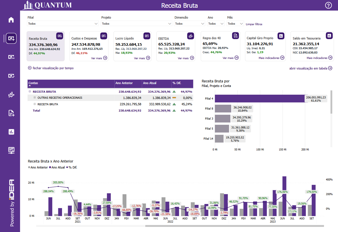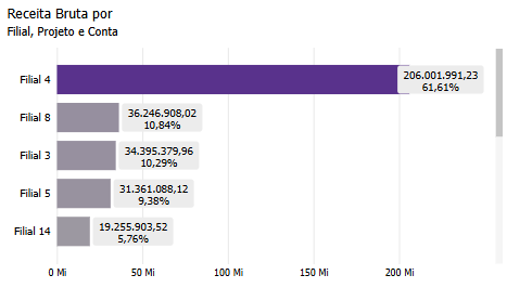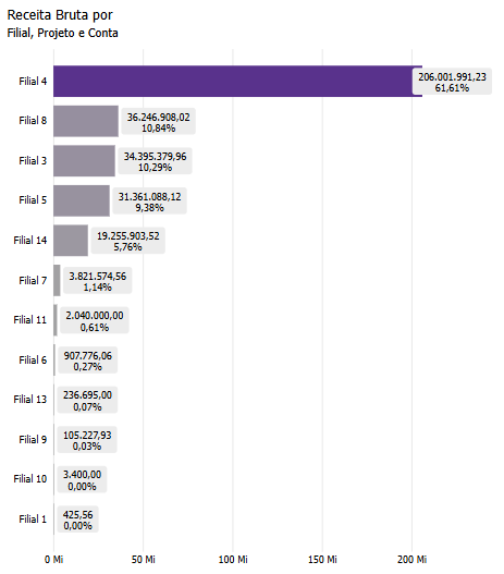 Além disso, os rótulos detalhados que exibem a porcentagem da Receita Bruta para cada categoria no gráfico de barras oferecem uma visão complementar às informações de variação percentual da tabela. Enquanto a tabela enfatiza a variação entre os anos, o gráfico de barras permite ver a representatividade relativa de cada Filial, Projeto ou Conta dentro do total de receitas atuais. Isso ajuda os usuários a identificar não apenas onde houve mudanças ao longo do tempo, mas também qual o peso atual de cada categoria em relação ao resultado geral.