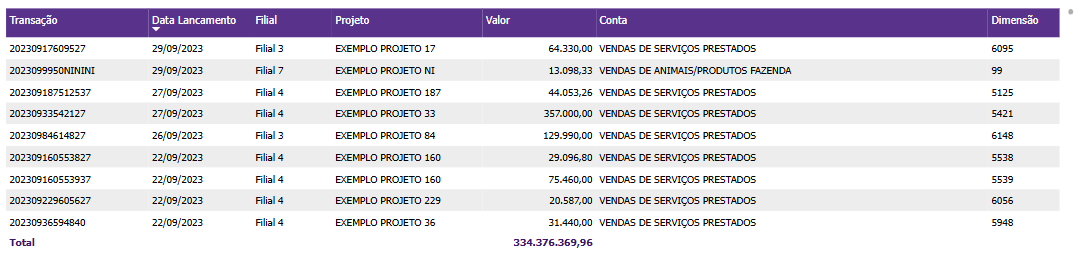A organização por transação garante que cada transação seja facilmente identificada e rastreável, sendo útil para reconciliar os dados com outros sistemas. A data de lançamento permite acompanhar a cronologia dos registros e entender quando as receitas foram realizadas. A coluna de filial mostra a unidade da empresa relacionada a cada receita, fornecendo uma visão regionalizada das operações, enquanto a coluna projeto facilita a associação de receitas a projetos específicos, sendo especialmente valiosa para empresas que trabalham com múltiplos projetos simultaneamente.