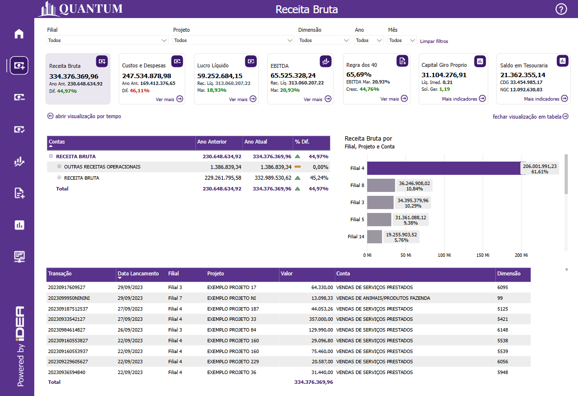 Além disso, o painel oferece uma análise detalhada da Receita Bruta por filial, projeto ou conta, permitindo que a empresa identifique quais áreas estão gerando mais receita. Essa análise granular é essencial para entender onde as principais fontes de receita estão concentradas e onde há oportunidades para aumentar as vendas e melhorar o desempenho financeiro. A segmentação da receita por diferentes dimensões também permite que as empresas comparem o desempenho de várias unidades, projetos ou contas e façam ajustes estratégicos para otimizar os resultados.