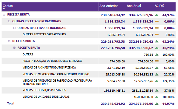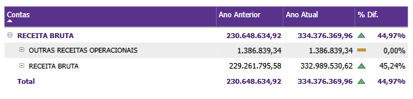 Os números de Receita Bruta para o Ano Atual oferecem uma visão do desempenho financeiro recente, servindo como um ponto de referência para avaliar a receita do Ano Anterior. Essa comparação é crucial para identificar tendências de crescimento ou declínio na receita, fornecendo insights valiosos sobre quais contas ou níveis experimentaram mudanças significativas. A coluna de Diferença Percentual é particularmente importante, pois quantifica a variação entre os dois anos, permitindo que os usuários avaliem a extensão do crescimento ou da redução da receita. Essa métrica ajuda a identificar quais áreas estão se destacando e quais podem precisar de ajustes estratégicos.