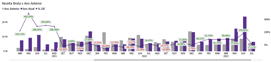 A linha da % diferença é uma adição crucial, pois destaca de maneira simples e eficaz as variações de desempenho entre os dois períodos. Pequenas variações nos valores de receita bruta podem passar despercebidas nas barras, mas a linha de diferença percentual permite identificar rapidamente as áreas de maior mudança, sejam elas positivas (aumento) ou negativas (redução). Assim, é possível avaliar rapidamente onde houve melhorias ou necessidade de ajustes no desempenho de receitas.