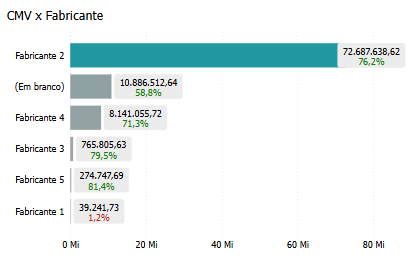 Além disso, o gráfico permite identificar fabricantes que têm baixos índices de CMV, o que pode indicar uma alta eficiência e confiabilidade em seus produtos. Esses fabricantes podem se tornar parceiros estratégicos, ajudando a reduzir custos associados a mercadorias e melhorar a rentabilidade da empresa.