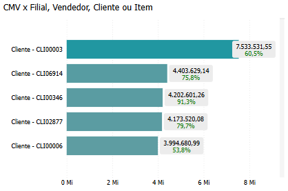 No geral, o gráfico de barras CMV x Filial, Vendedor, Cliente ou Item oferece uma análise detalhada dos custos de mercadorias vendidas, tanto em termos de valor monetário quanto de porcentagem em relação às vendas, com indicadores visuais (vermelho/verde) que facilitam a identificação de áreas críticas. Ele capacita os tomadores de decisão a identificar áreas problemáticas, otimizar custos e melhorar a eficiência geral. Com essas informações, a empresa pode aprimorar seus processos operacionais, de vendas e de fornecimento.