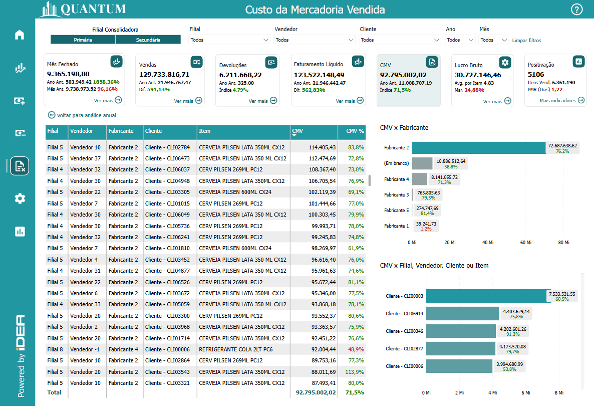 Análises detalhadas do CMV por Filial, Vendedor, Cliente, Fabricante ou Item são essenciais para uma compreensão mais aprofundada dos custos em várias dimensões do negócio. Esse tipo de análise permite que as empresas identifiquem quais locais, produtos ou fornecedores estão gerando maiores custos, ajudando a ajustar estratégias de compra, negociação com fornecedores ou processos de fabricação. Além disso, essa análise detalhada revela quais produtos têm os maiores custos de produção e venda, permitindo à empresa ajustar sua estratégia de estoque e mix de produtos para otimizar a lucratividade.