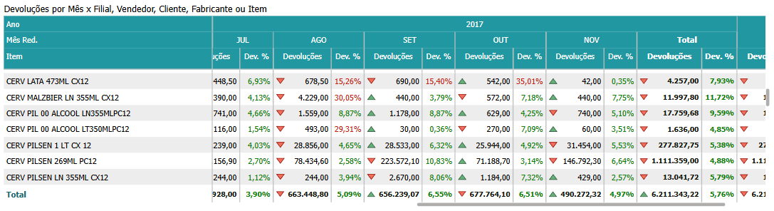 Devoluções por Mês x Filial, Vendedor, Cliente, Fabricante ou Item¶