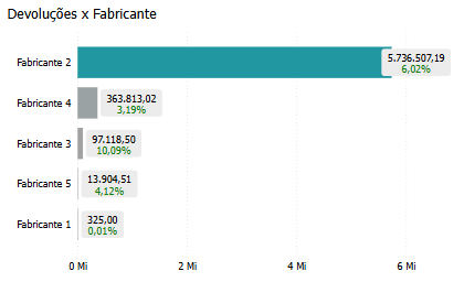 No geral, o gráfico de barras Devoluções x Fabricante oferece uma visão detalhada e essencial para a gestão da cadeia de suprimentos, com indicadores visuais (vermelho/verde) que facilitam a identificação de áreas críticas. Ele capacita os tomadores de decisão a avaliar o desempenho dos fabricantes, fortalecer relações com fornecedores confiáveis e mitigar problemas de devolução que impactam diretamente a rentabilidade e a experiência do cliente.