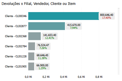 Um gráfico de barras intitulado Devoluções x Filial, Vendedor, Cliente ou Item oferece uma representação visual poderosa do desempenho de devoluções, segmentado por várias dimensões comerciais importantes, como Filial, Vendedor, Cliente ou Item. Cada barra no gráfico representa uma dessas dimensões e exibe tanto o valor monetário quanto a porcentagem de devoluções, permitindo que a empresa analise como as devoluções estão distribuídas entre diferentes entidades.