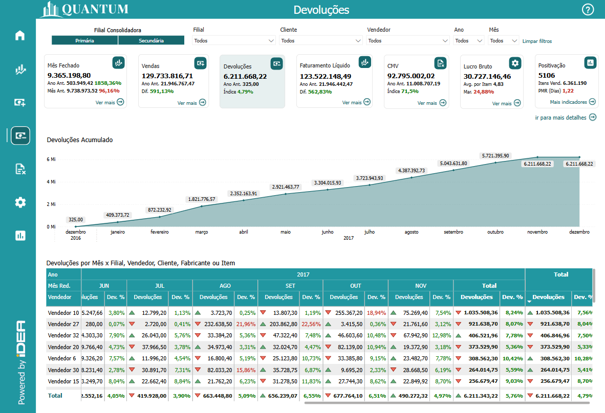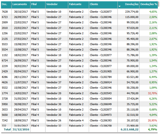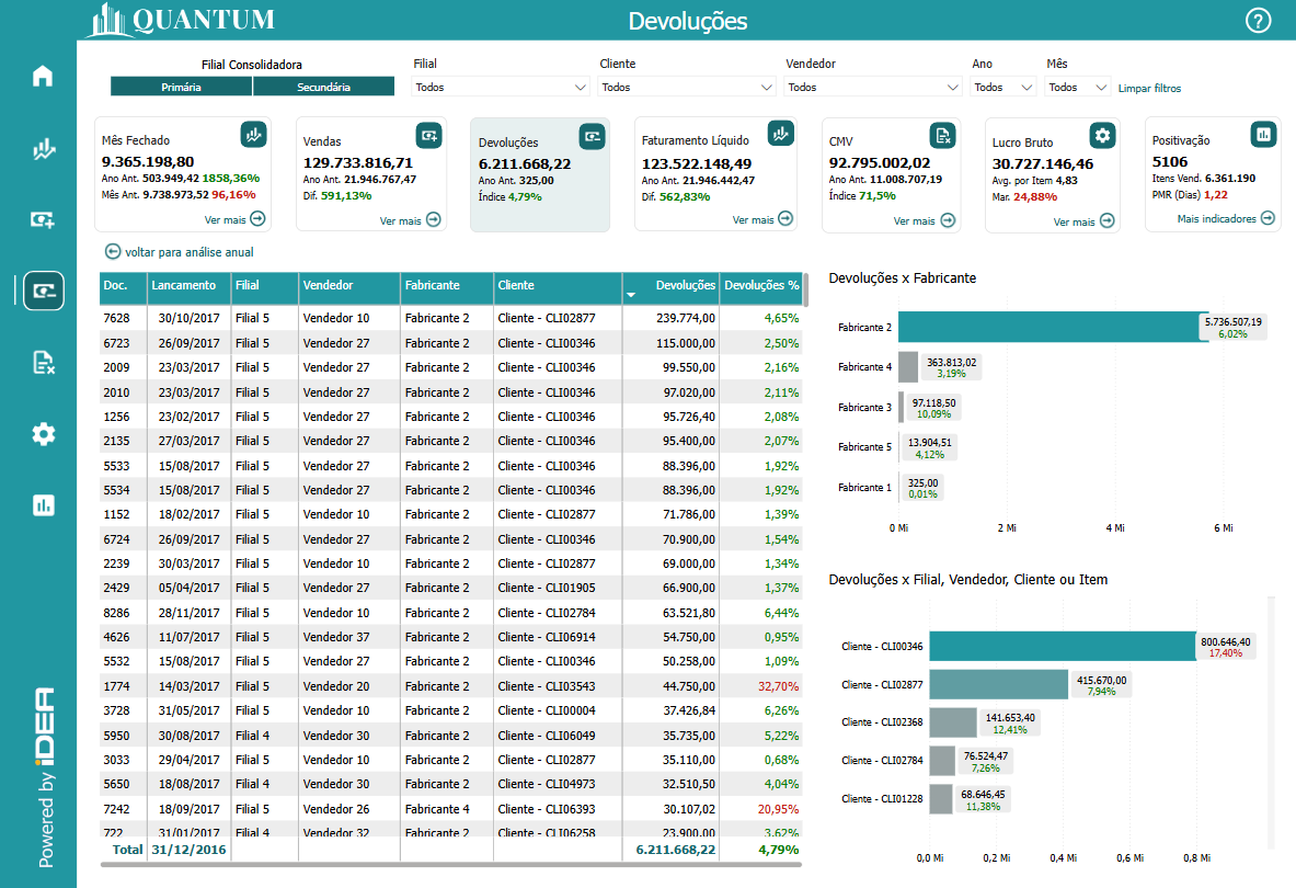 Análises detalhadas de devoluções por Filial, Vendedor, Cliente, Fabricante ou Item são fundamentais para uma visão aprofundada dos desafios enfrentados pelo negócio. Esse tipo de análise permite que as empresas identifiquem quais locais, vendedores, produtos ou fabricantes estão gerando mais devoluções, revelando potenciais problemas de qualidade, logística ou atendimento ao cliente. Compreender essa distribuição ajuda a identificar pontos fracos que podem estar afetando a percepção da marca, permitindo a adoção de medidas corretivas, como programas de melhoria de produto, treinamentos para equipes de vendas ou ajustes no suporte ao cliente.