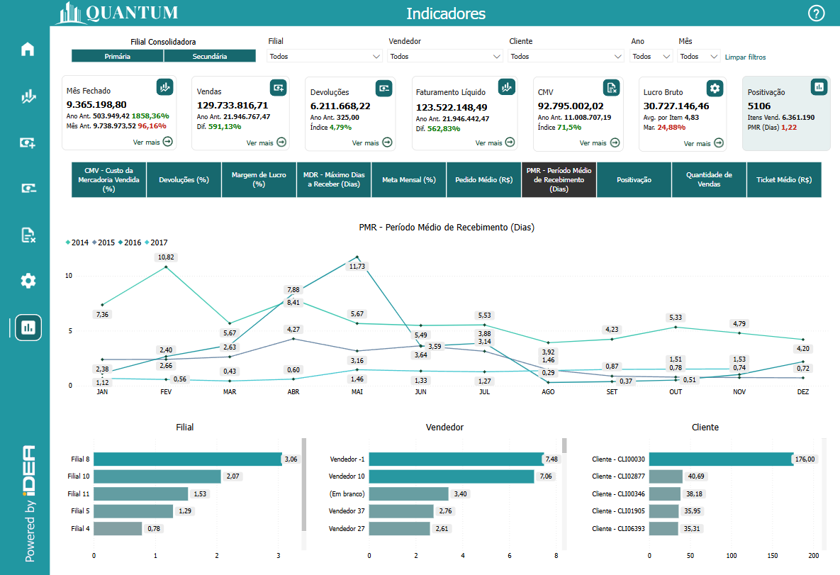 Além do gráfico de linhas, o Painel Indicadores inclui três gráficos de barras que fornecem uma análise detalhada do desempenho por Filial, Vendedor e Cliente. Os gráficos de barras permitem uma comparação clara e direta entre diferentes categorias, ajudando a identificar quais filiais, vendedores e clientes estão gerando mais receita, qual é a performance de cada um e onde há oportunidades para melhorias. Essa segmentação é essencial para uma gestão mais granular, permitindo que os gestores possam avaliar o desempenho em diferentes níveis da organização e identificar áreas que necessitam de atenção ou de estratégias específicas.