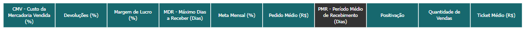 O conjunto de botões, funcionando como um filtro interativo, é uma ferramenta poderosa para personalizar a visualização dos dados na página. Cada botão representa um dos indicadores-chave: CMV - Custo da Mercadoria Vendida (%), Devoluções (%), Margem de Lucro (%), MDR (Dias), Meta Mensal (%), Pedido Médio (R\(), PMR - Período Médio de Recebimento (Dias), Positivação, Quantidade de Vendas e Ticket Médio (R\)). Ao clicar em um dos botões, a página é filtrada para exibir informações específicas relacionadas ao indicador selecionado, ajustando os quatro visuais principais para refletir os dados correspondentes.