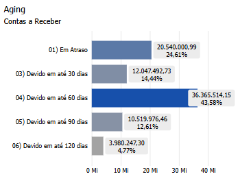 O gráfico de barras é dividido em 7 categorias, a primeira das quais é o valor que já está vencido. Em seguida, vem o tempo em que esse valor é devido, começando em 0 dias (com vencimento imediato), progredindo em intervalos de 30 dias e terminando com qualquer coisa que seja devida em 120 dias ou mais.