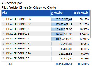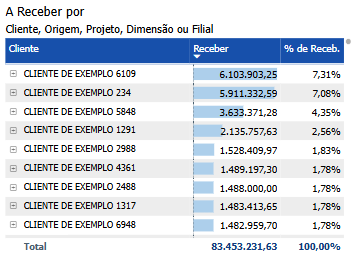 A matriz exibe tanto o valor total de recebimento quanto a porcentagem (%) que cada cliente, origem, projeto, dimensão ou filial representa no total, fornecendo uma visão clara da contribuição relativa de cada categoria. Esses indicadores facilitam a priorização de áreas que demandam mais atenção, possibilitando ajustes mais rápidos e eficazes nos processos de cobrança e gerenciamento de recebíveis. As barras de dados em azul claro atrás dos valores na matriz atuam como um auxílio visual importante para a comparação. Elas fornecem um contexto visual imediato para os valores exibidos, destacando a magnitude relativa de cada categoria. Esse contraste entre as barras de dados e os valores facilita a visualização das diferenças e semelhanças entre os itens, permitindo que os stakeholders identifiquem rapidamente quais categorias têm maiores ou menores valores em comparação com o total. Ao criar uma base de referência visual, as barras de fundo ajudam a interpretar os dados de maneira mais intuitiva, tornando mais fácil detectar padrões, variações e tendências significativas. Essa representação visual aprimorada apoia a análise financeira ao transformar dados complexos em informações visualmente acessíveis e compreensíveis.