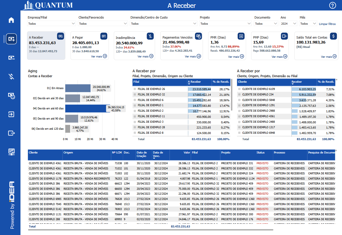 Uma matriz exibindo os valores de A Receber por Cliente, Origem, Projeto, Dimensão ou Filial é uma ferramenta essencial para análise financeira e tomada de decisões estratégicas. Ao organizar os recebíveis com base nessas categorias específicas, a matriz permite que os stakeholders identifiquem rapidamente onde os valores de recebimento estão concentrados e monitorem os pagamentos devidos por diferentes clientes, origens de receita ou projetos. Esse nível de detalhamento é crucial para uma gestão eficiente do fluxo de caixa, destacando quais áreas estão gerando mais recebimentos e ajudando a identificar eventuais riscos ou oportunidades de otimização financeira.