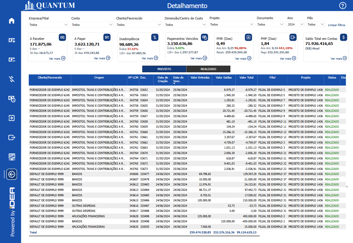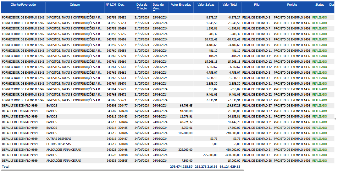A tabela em si contém todas as informações principais encontradas em todo o relatório. Embora cada painel tenha sua própria tabela, a tabela de detalhes no painel oferece uma visão combinada dos dados, por exemplo, pode mostrar as transações A Receber e A Pagar ao mesmo tempo. Isso pode ser útil ao analisar casos ou documentos específicos, pois permite uma perspectiva mais ampla sobre os movimentos relevantes.