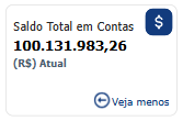 Botão "Ver mais" ao ser clicado, este botão abre uma tabela detalhada do Saldo Total em Contas, mostrando o saldo atual por conta. Esta visualização está disponível em todas as páginas do relatório. Quando a tabela está aberta, o botão "Ver mais" é substituído por um botão "Veja menos", permitindo fechar a tabela e retornar à visualização anterior.