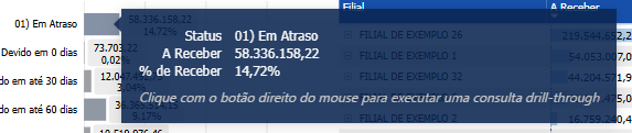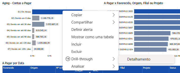 A função usada para fazer isso é chamada de "Drill-through" e pode ser executada clicando com o botão direito em um visual e selecionando Drill-through no menu que aparece, isso estenderá o menu que mostra "Detalhamento". Uma vez clicado, o Painel de Detalhamento será aberto e será filtrado automaticamente pelo ponto de dados em que você clicou com o botão direito. Abaixo está um exemplo de clique com o botão direito na barra para 01) Em Atraso no visual Aging - Contas a Pagar;