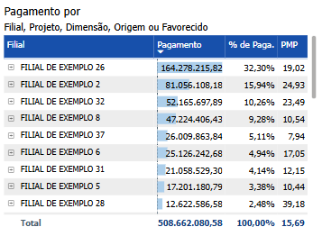 A matriz exibe o valor total de Pagamentos, a porcentagem (%) de Pagamentos em relação ao valor global, e o PMP (Período Médio de Pagamento), proporcionando uma visão clara da contribuição de cada categoria e da eficiência dos processos de pagamento. Esses indicadores auxiliam na priorização de áreas que requerem mais atenção ou ajustes, garantindo uma alocação eficaz dos recursos e monitoramento. As barras de dados em azul claro, posicionadas atrás dos valores na matriz, funcionam como uma importante ferramenta visual, oferecendo um contexto imediato para comparação dos valores apresentados. O contraste visual facilita a percepção das diferenças entre as categorias, permitindo que os usuários identifiquem rapidamente aquelas com maiores ou menores pagamentos em relação ao total. Essa representação visual torna os dados mais acessíveis e compreensíveis, simplificando a análise de padrões e tendências relevantes.
