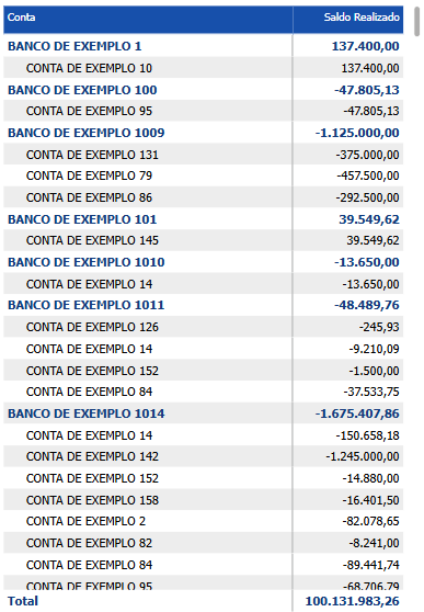 Visão geral financeira abrangente: Esta tabela oferece um instantâneo completo do status financeiro atual exibindo os saldos de todas as contas dentro do plano de conta. Ao agregar dados de cada conta financeira, ela permite que você monitore a saúde financeira geral da organização. Esta visão abrangente é essencial para entender como os fundos disponíveis são distribuídos entre diferentes contas e como eles se alinham com estratégias e metas financeiras;